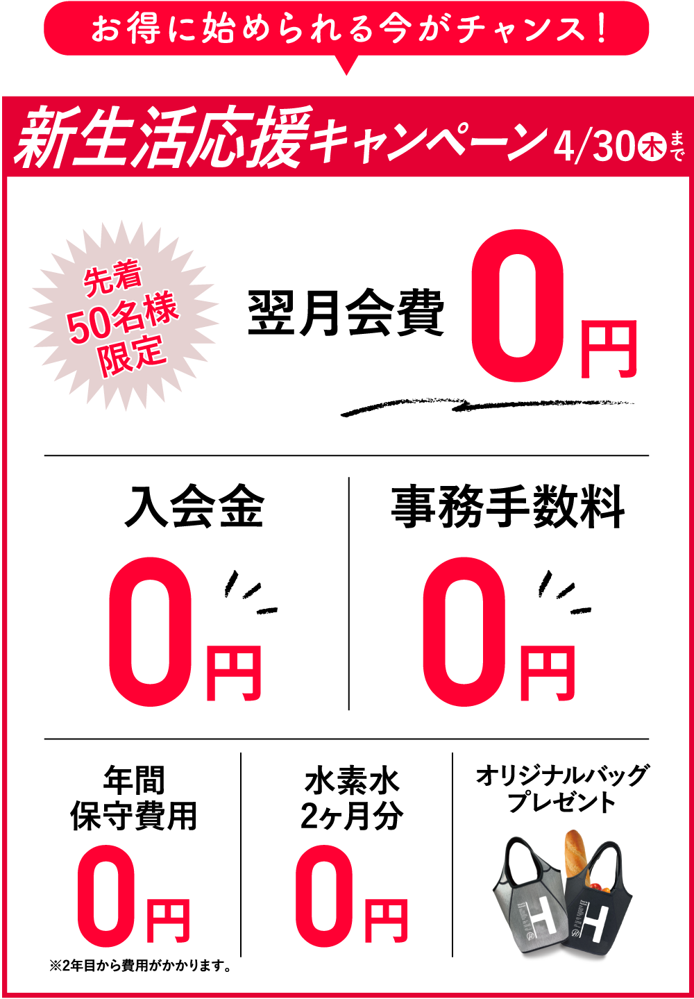 翌月会費0円+入会金0円+事務手数料0円+保守費用0円(2年目から費用がかかります)+水素水2ヶ間0円+オリジナルバック!
