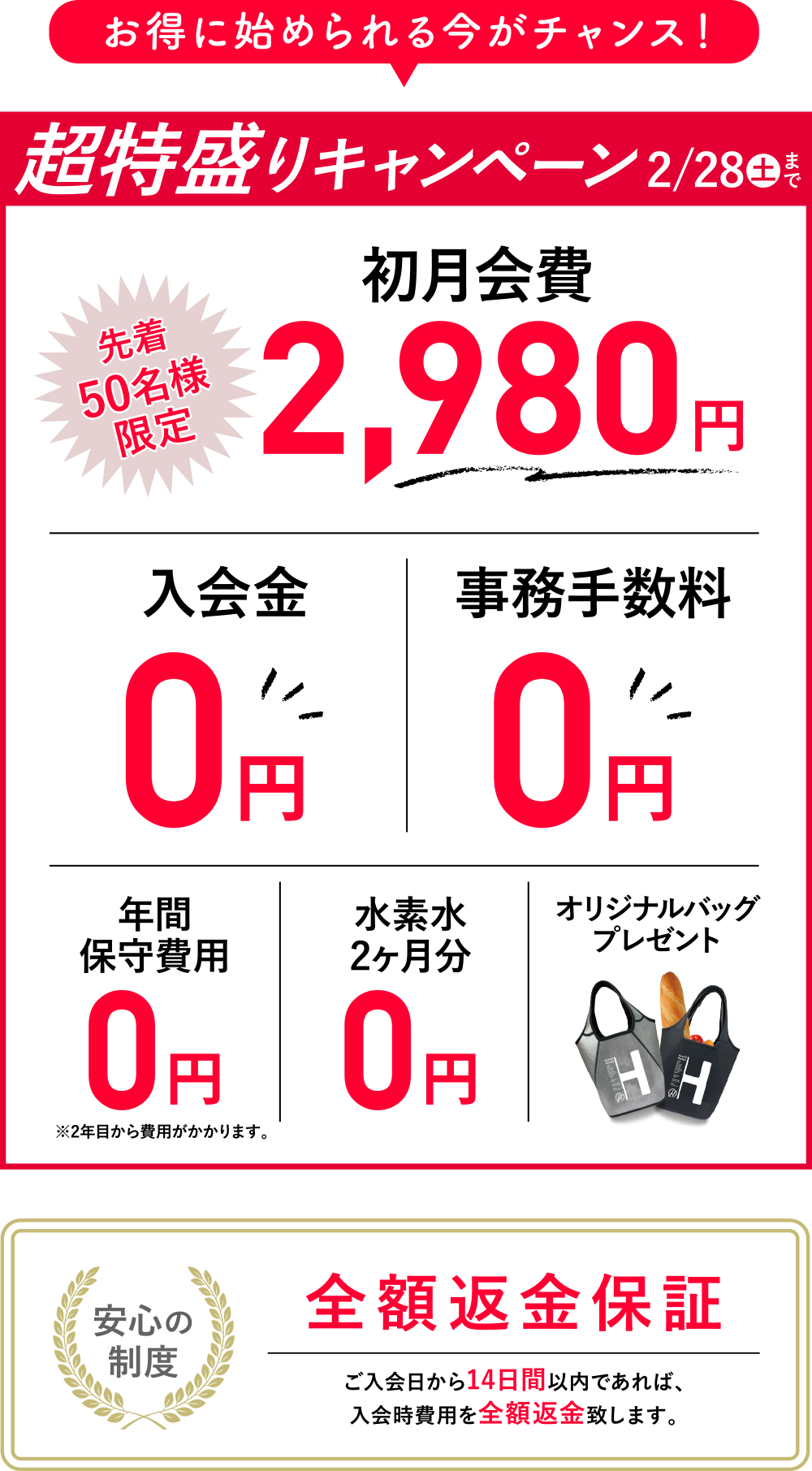 月会費1ヶ月0円+水素水2ヶ間0円+オリジナルバック!